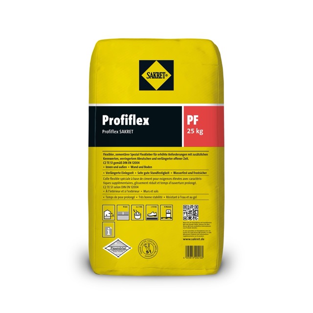 La colle à carrelage PROFIFLEX est une colle flexible spéciale à base de ciment pour exigences élevées, avec glissement réduit et temps d’ouverture prolongé.